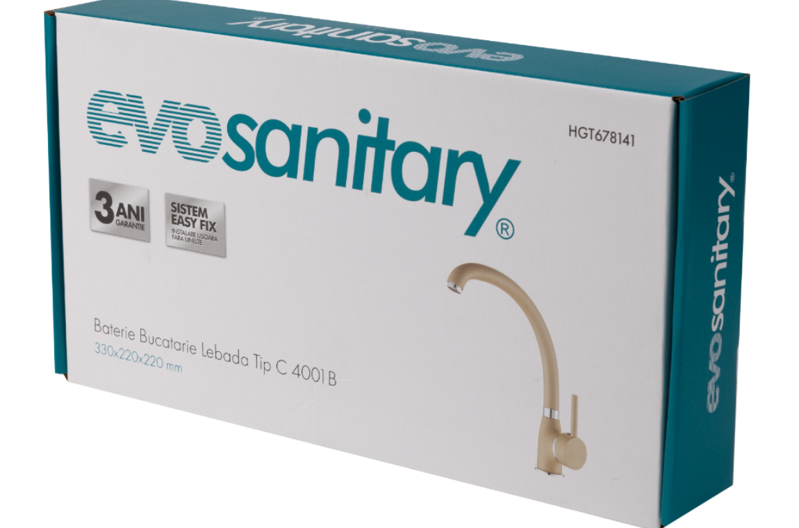 Bateria de bucatarie tip lebada ofera un mediu de lucru mai destins prin forma arcuita pe care o detine.Aceasta este echipata cu un cartus ceramic cu diamterul de 40 mm, o garnitura din cauciuc si 2 racordui flexibile cu o lungime de 350 mm.