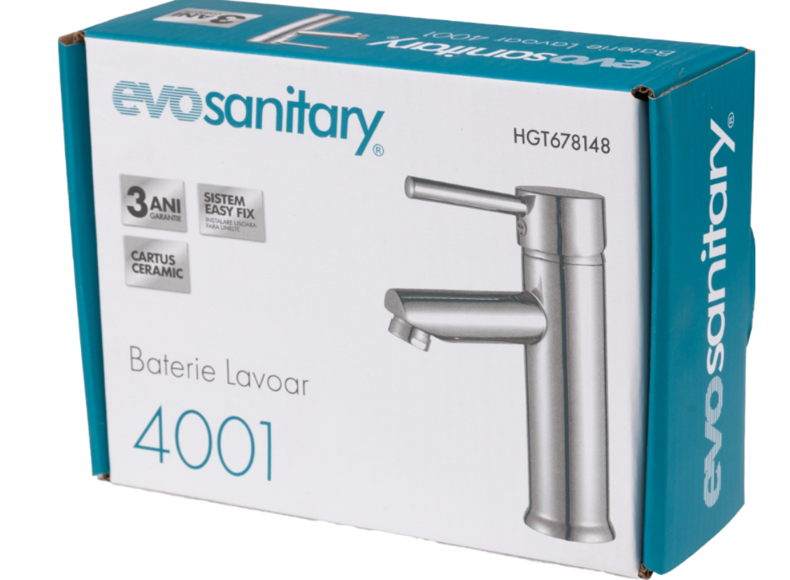 Bateria pentru lavoar Evosanitary 4001 este o alegere practică și estetică pentru baia dumneavoastră. Aceasta este de tip monocomandă, realizată din alamă cu finisaj cromat lucios de culoare argintie, oferind un design modern și o calitate superioară