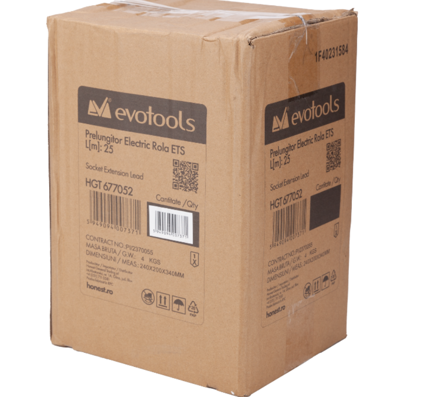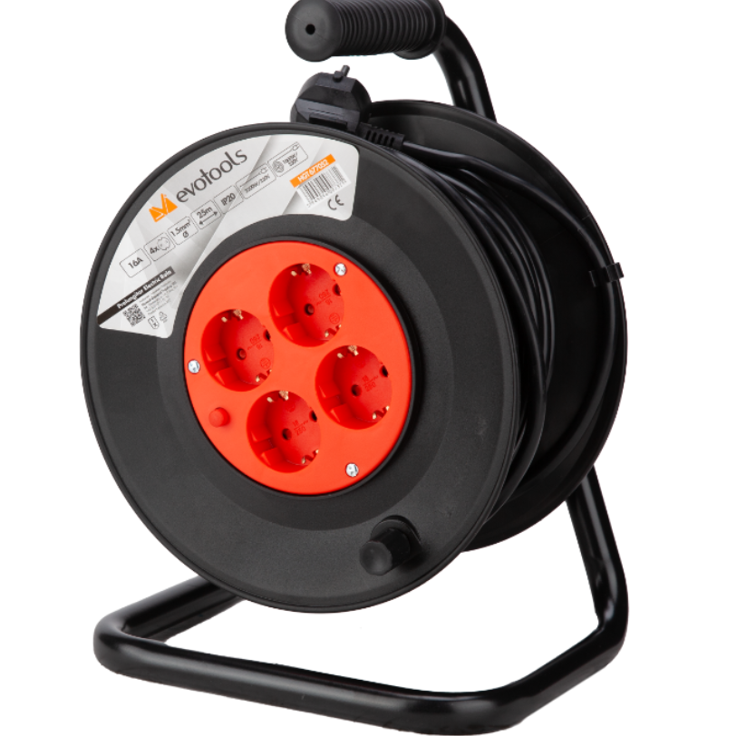 Prelungitorul electric tip rola EvoTools este alegerea ideala pentru situatii in care doriti extinderea sursei de alimentare in locuri in care nu aveti acces la o priza. Puterea consumatorului nu trebuie sa depaseasca 2500 W. Materialul folosit la izolarea cablului este de buna calitate, avand o rezistenta ridicata la frecare. Tamburul este din ABS dispus pe un cadru realizat din metal oferind astfel o rezistenat mare la socuri mecanice. Mansonul din cauciuc aflat pe cadrul metalic va ofera o priza eficienta in timpul uilizarii, facand usoara folosirea acestui prelungitor. Rola este prevazuta cu un buton pentru restabilirea protectiei termice. Conectorrul de tip schuko are o tensiune de alimantare de 230 V si 50 Hz.