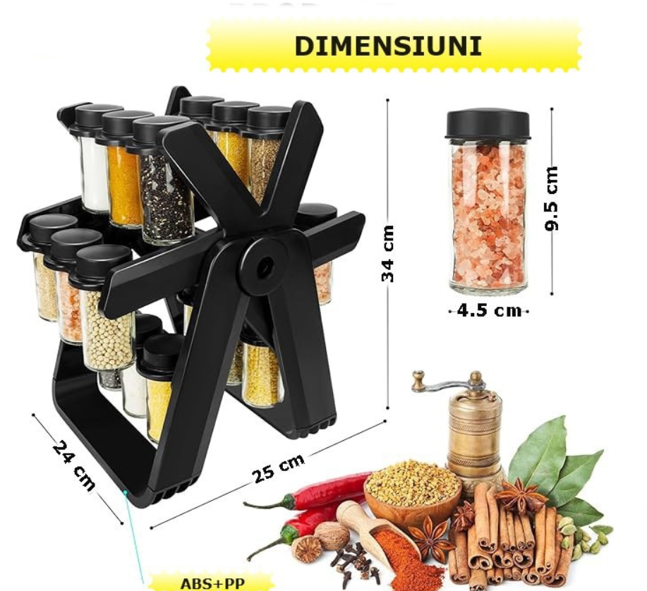 Suportul rotativ este confecționat din material rezistent și durabil, avand un aspect elegant, perfect pentru orice tip de bucătărie. Recipientele sunt realizate din sticlă de calitate, prevăzute cu capace ermetice care păstrează aromele și prospețimea condimentelor pentru mai mult timp.